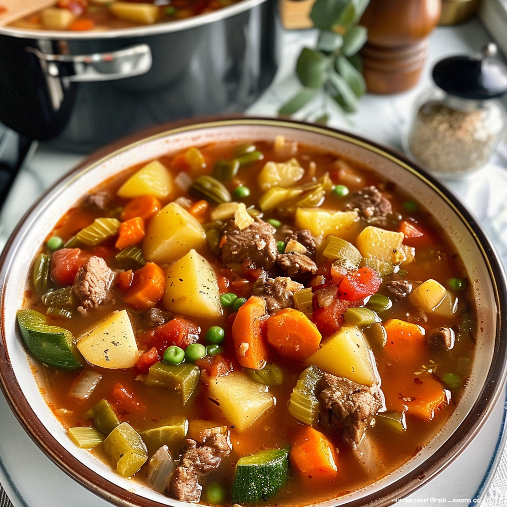 Cooking this vegetable beef soup always brings back memories of family gatherings where laughter filled the air and bowls were never empty.