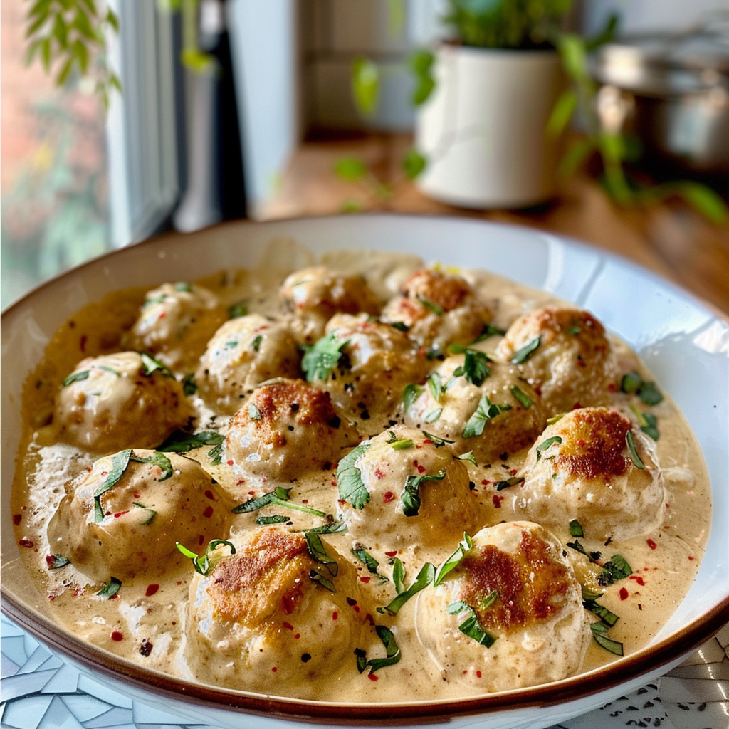 Dive into a comforting plate of Chicken Meatballs in Cream Sauce—succulent, tender chicken meatballs bathed in a rich, velvety cream sauce. This dish is perfect for weeknight dinners or special occasions, offering an irresistible blend of flavors that will warm your heart and delight your taste buds.