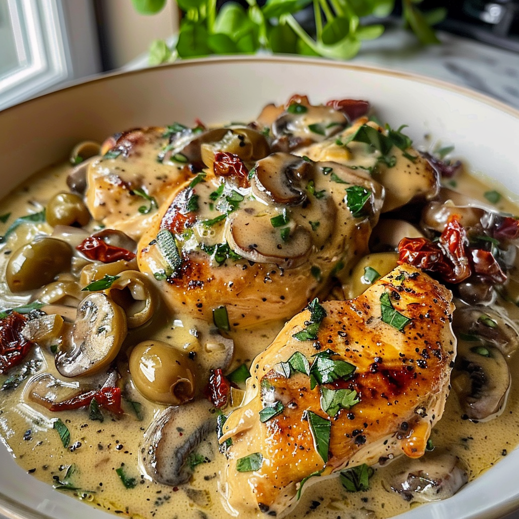 Creamy Mushroom Chicken with Sun-Dried Tomatoes and Olives