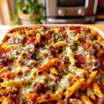Pepperoni and Sausage Pizza Pasta is a comforting fusion dish that combines the classic flavors of pizza with tender pasta. This easy-to-make recipe features al dente penne pasta coated in a rich tomato sauce, savory Italian sausage, and crispy pepperoni, all topped with gooey mozzarella and parmesan cheese. Perfect for family dinners or cozy nights in, this dish is sure to impress your guests while delivering a satisfying burst of flavor in every bite.