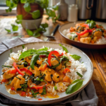 Experience a burst of tropical flavors with Spiced Coconut Basil Chicken paired with fluffy rice. This dish features succulent chicken simmered in a rich coconut sauce, infused with fresh basil and aromatic spices. Perfect for weeknight dinners or impressing guests, each bite is a harmonious dance of flavors that will transport you to sun-kissed shores.