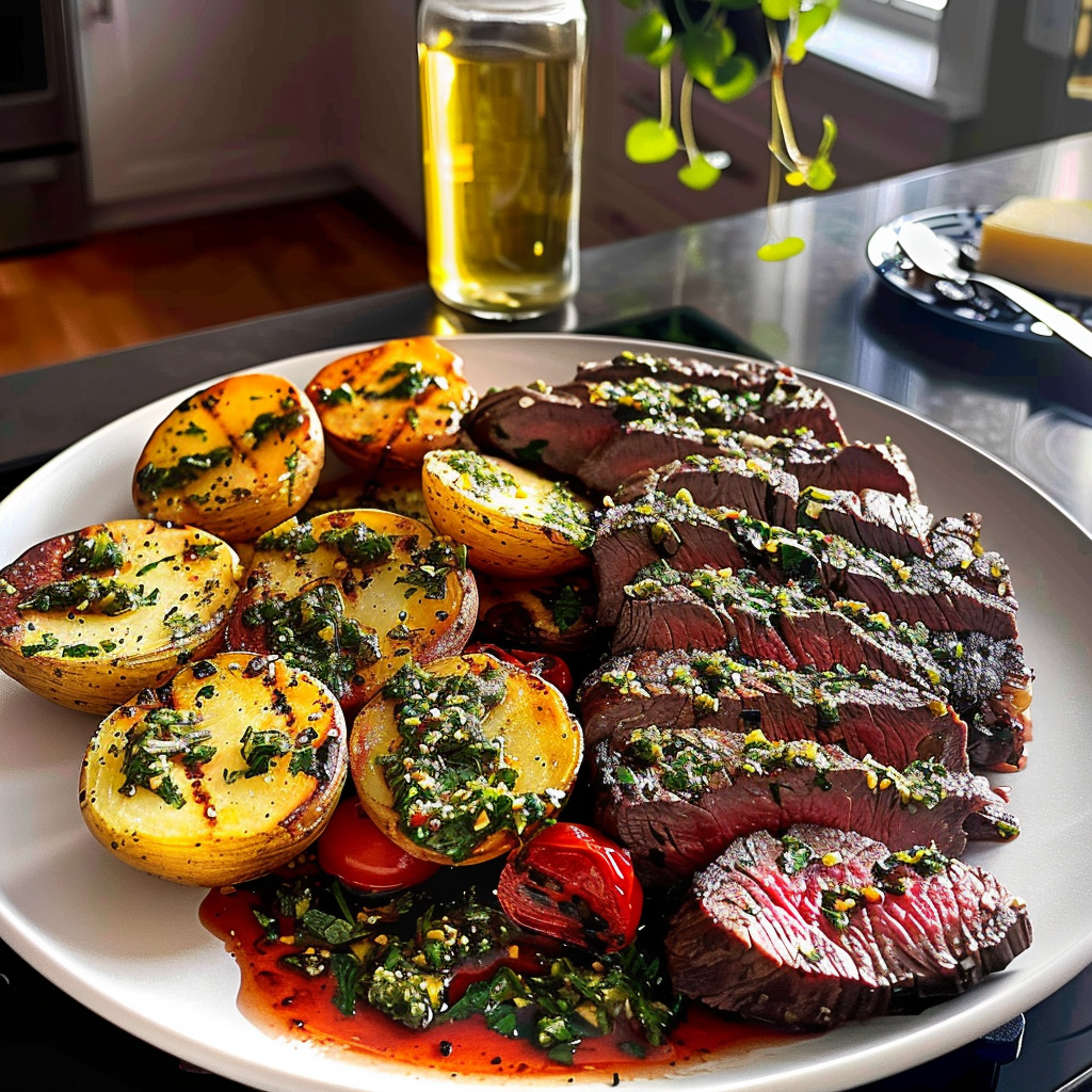 - Slice the steak against the grain and plate it alongside roasted potatoes; drizzle generously with chimichurri sauce.